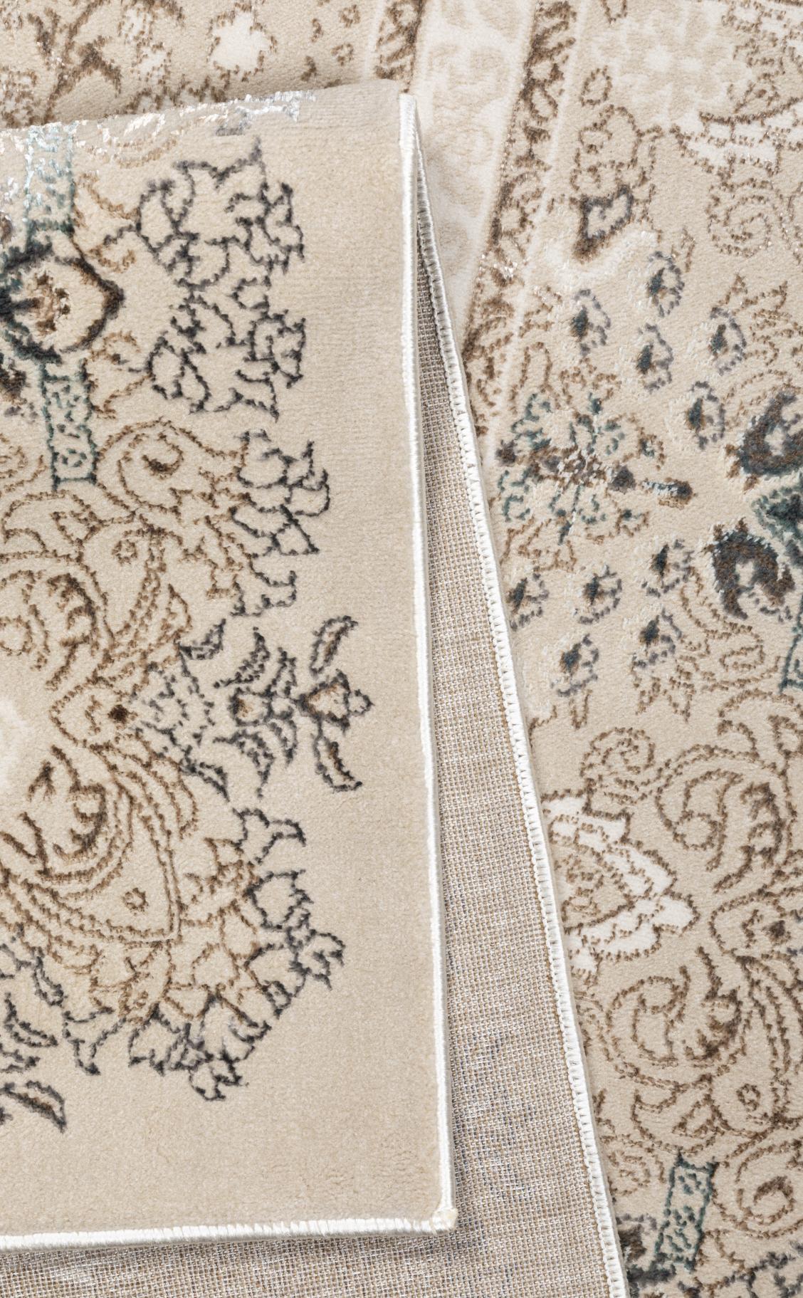 Misterny, niezwykle starannie wykonany wzór utrzymany w różnych odcieniach beżu z delikatnym dodatkiem koloru kremowego cieszy oko bogatym wzornictwem, ze starannie wytkanymi detalami.