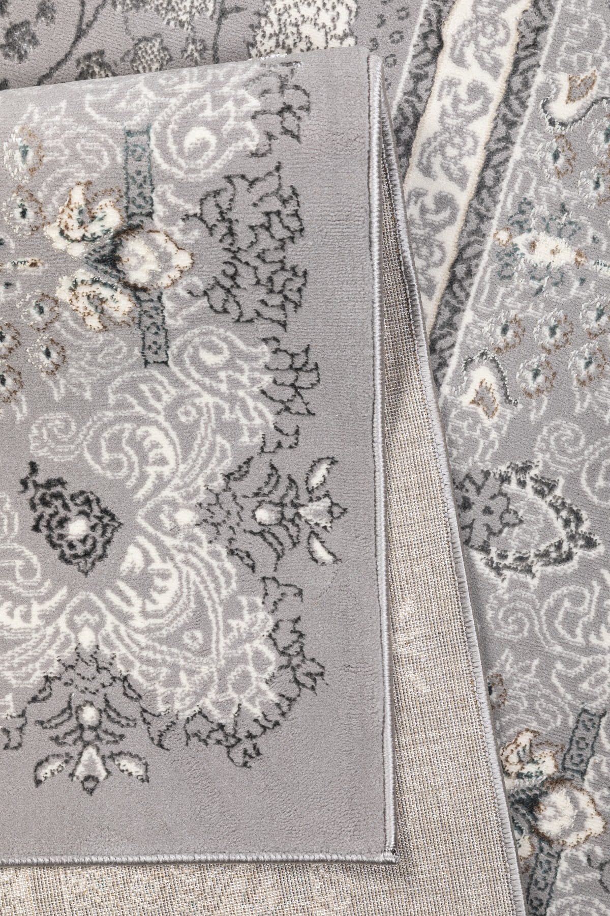 Misterny, niezwykle starannie wykonany wzór utrzymany w różnych odcieniach szarości z delikatnym dodatkiem koloru kremowego cieszy oko bogatym wzornictwem, ze starannie wytkanymi detalami.