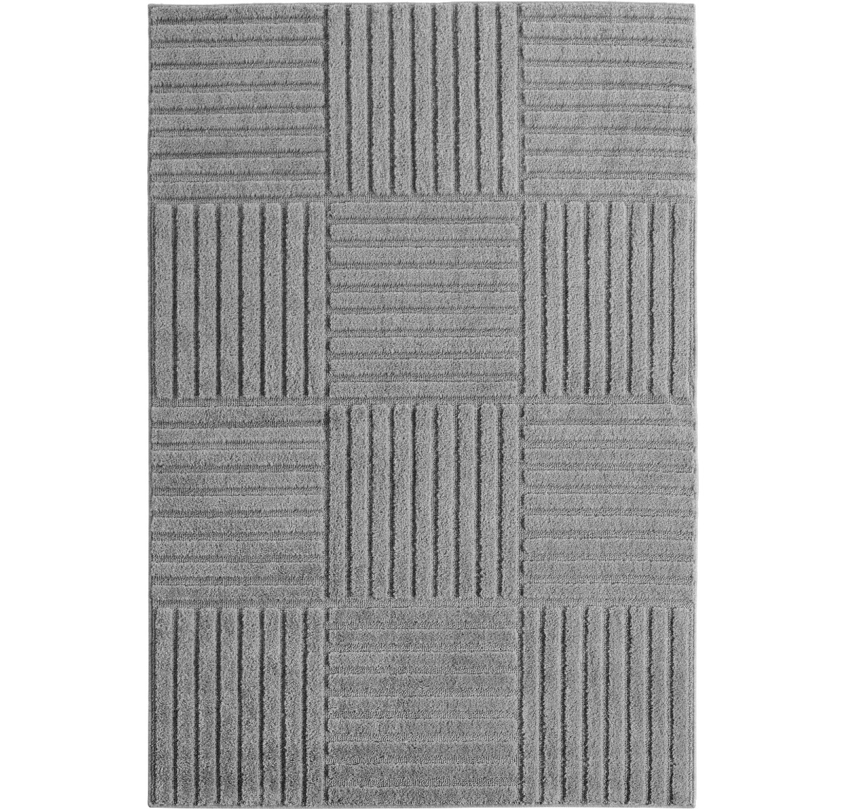 Szary dywan geometryczny 3D z motywem kwadratów. Trwały, łatwy w czyszczeniu i certyfikowany Oeko-Tex. Idealny do salonu, sypialni, na ogrzewanie podłogowe.
