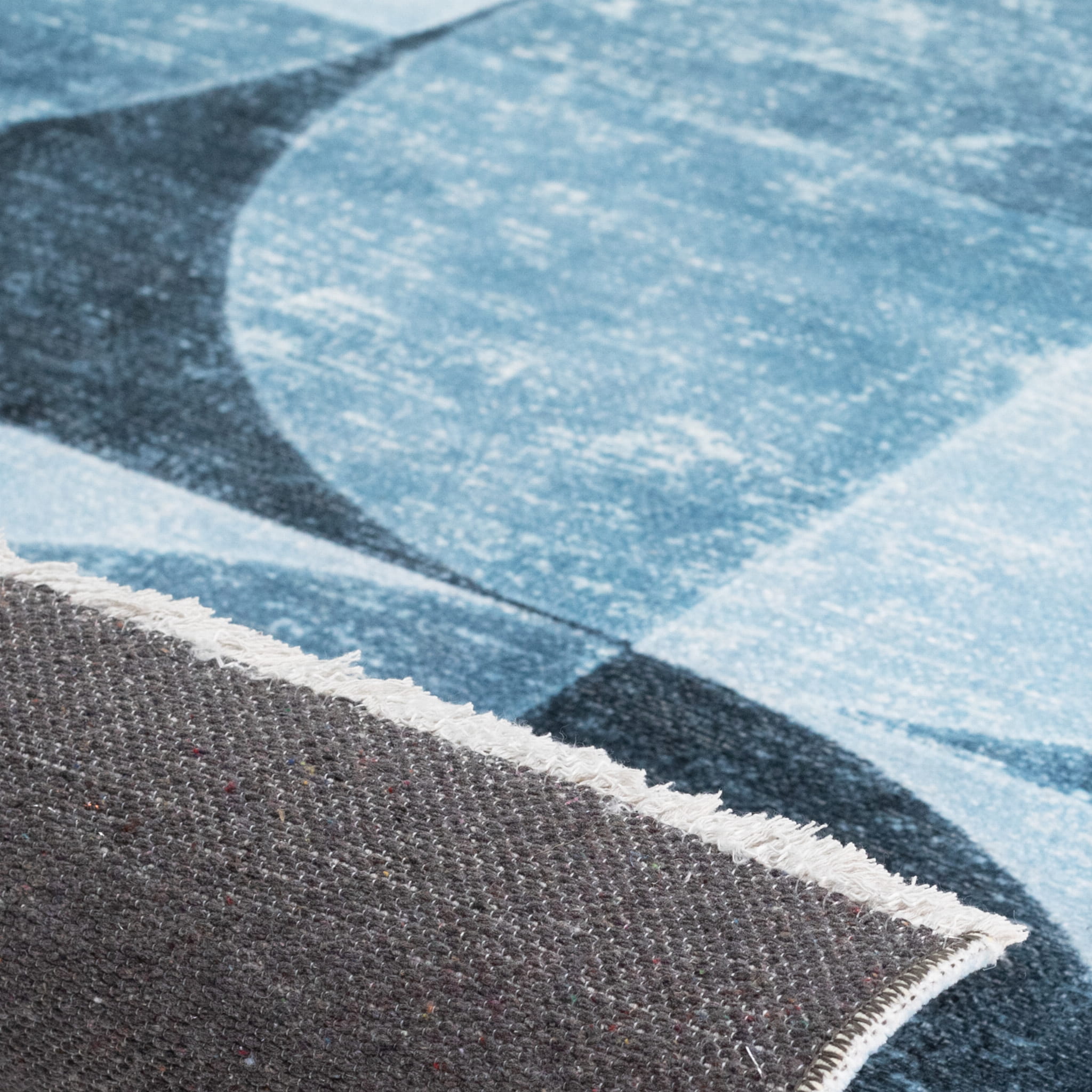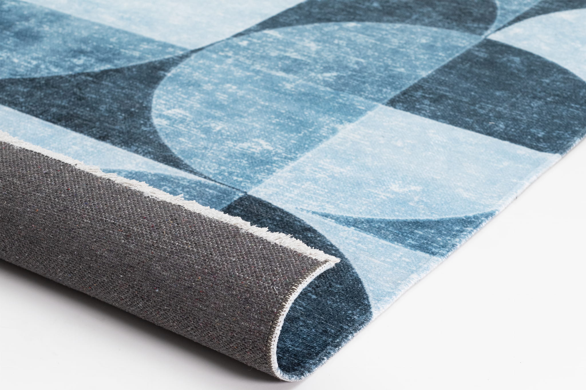 Odkryj dywan nowoczesny Dean  niebieski który charakteryzującej się mocnymi barwami, wyrazistymi formami i geometrycznymi teksturami. Niebieska kolorystyka w połączeniu z modnym efektem "przetarcia" i postarzenia (vintage look) tworzy stylowy, klimatyczny akcent, który przyciąga wzrok, ale nie przytłacza. Bawełniane frędzle na krótszych końcach dodatkowo podkreślają ten unikalny, klimatyczny styl.