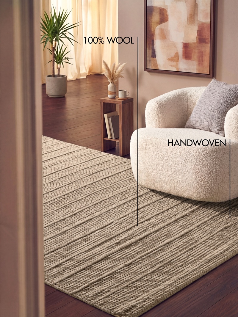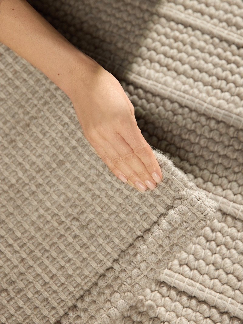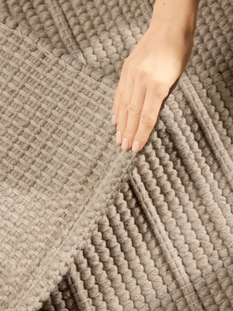 Powierzchnia dywanu składa się z regularnych poziomych pasów, w których naprzemiennie zastosowano dwa rodzaje struktury. Pierwszy z nich tworzy gęsty, drobny splot, przypominający delikatną tkaninę o jednolitej, zwartej fakturze. Drugi natomiast wyróżnia się bardziej wypukłą, plecioną strukturą, w której widoczne są większe, wyraźniejsze oczka przędzy. Dzięki temu na powierzchni dywanu powstaje subtelny efekt trójwymiarowości, który zmienia się w zależności od kąta padania światła.