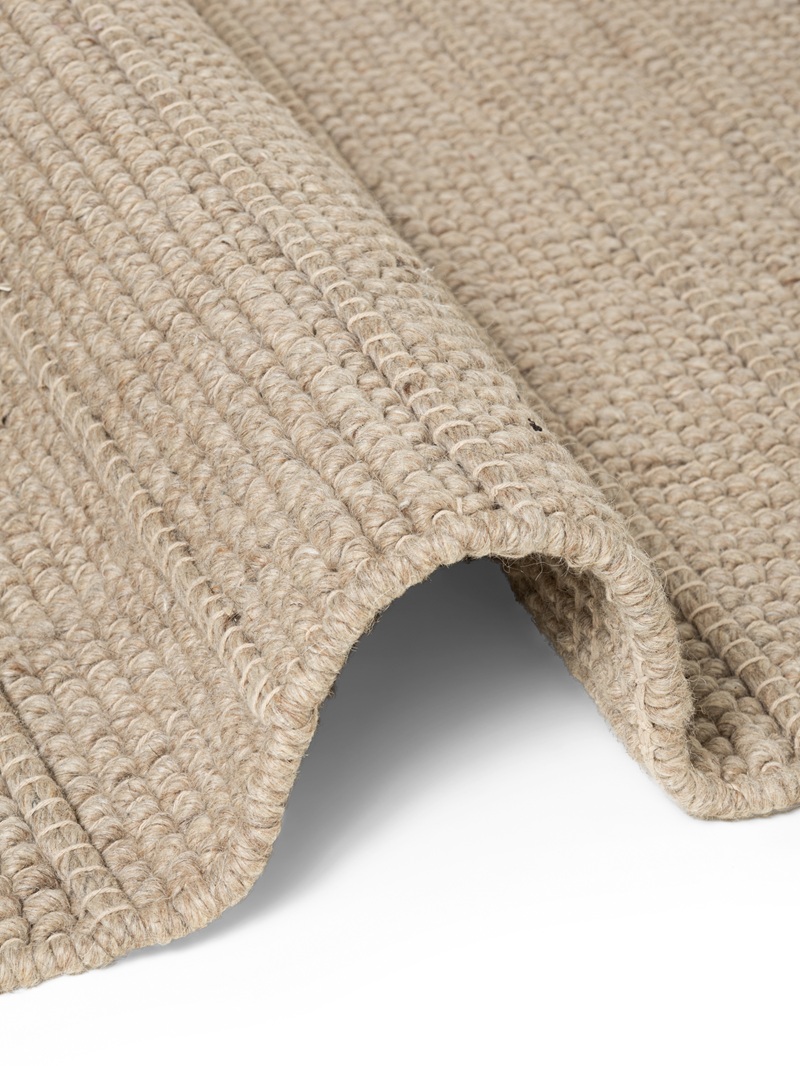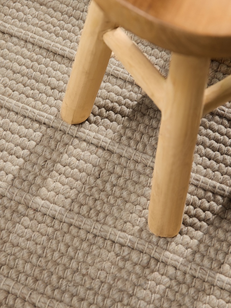 Powierzchnia dywanu składa się z regularnych poziomych pasów, w których naprzemiennie zastosowano dwa rodzaje struktury. Pierwszy z nich tworzy gęsty, drobny splot, przypominający delikatną tkaninę o jednolitej, zwartej fakturze. Drugi natomiast wyróżnia się bardziej wypukłą, plecioną strukturą, w której widoczne są większe, wyraźniejsze oczka przędzy. Dzięki temu na powierzchni dywanu powstaje subtelny efekt trójwymiarowości, który zmienia się w zależności od kąta padania światła.