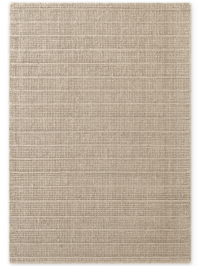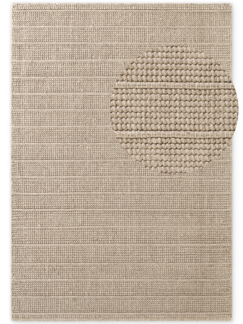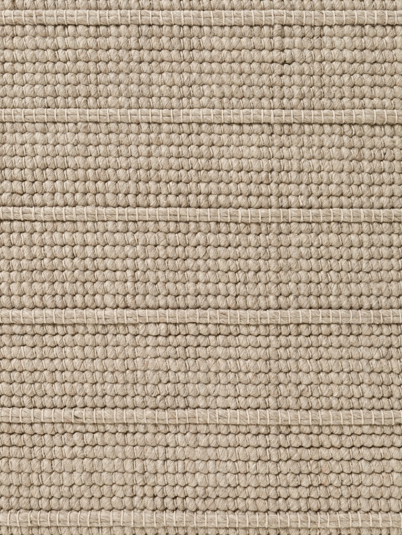 Powierzchnia dywanu składa się z regularnych poziomych pasów, w których naprzemiennie zastosowano dwa rodzaje struktury. Pierwszy z nich tworzy gęsty, drobny splot, przypominający delikatną tkaninę o jednolitej, zwartej fakturze. Drugi natomiast wyróżnia się bardziej wypukłą, plecioną strukturą, w której widoczne są większe, wyraźniejsze oczka przędzy. Dzięki temu na powierzchni dywanu powstaje subtelny efekt trójwymiarowości, który zmienia się w zależności od kąta padania światła.