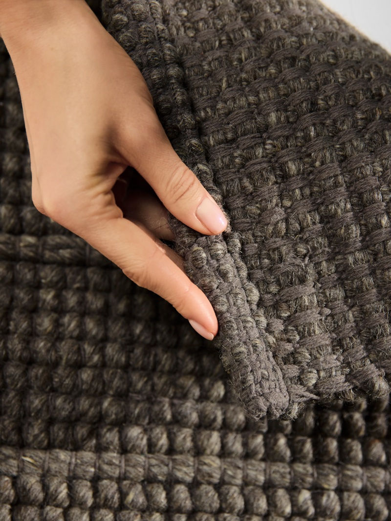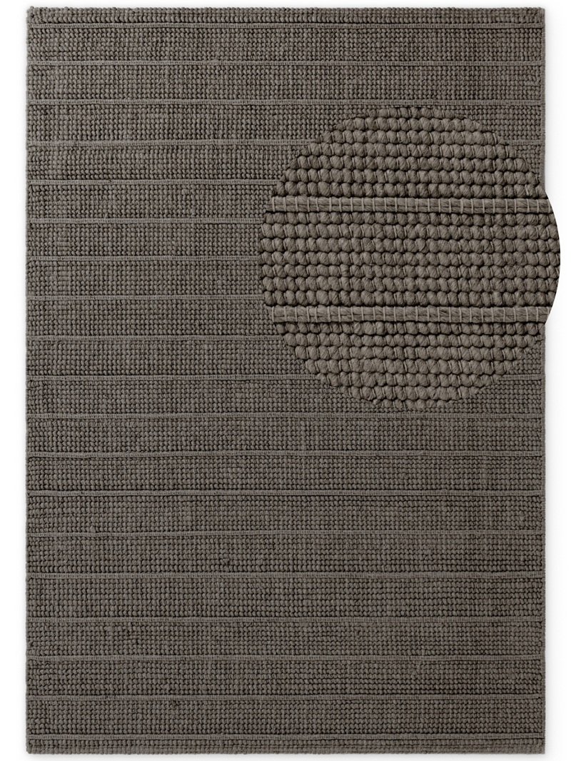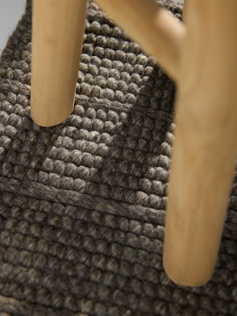 Subtelne przenikanie się brązowych i szarych tonów podkreśla strukturę wełnianego splotu, nadając powierzchni dywanu głębię i naturalny charakter.