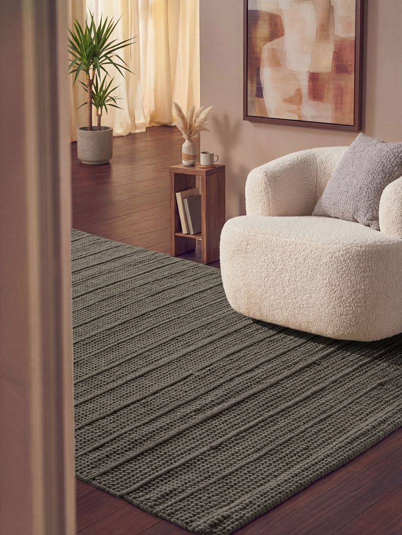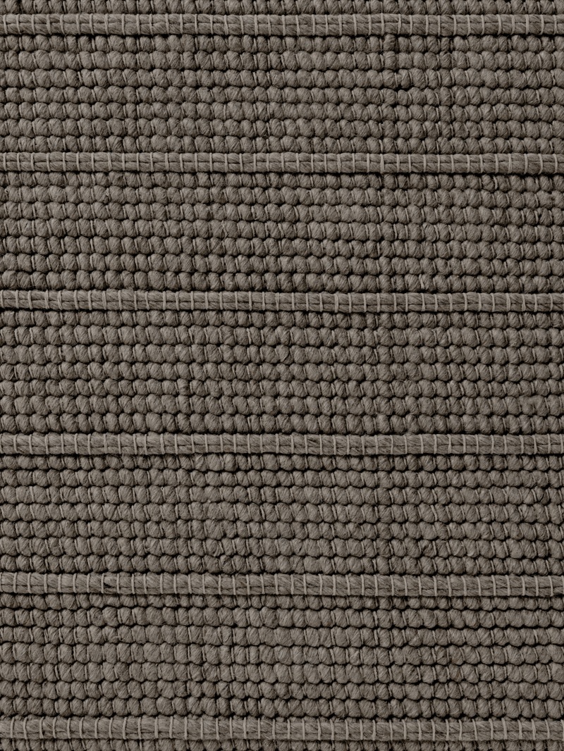 Powierzchnia dywanu składa się z regularnych poziomych pasów, w których naprzemiennie zastosowano dwa rodzaje struktury. Pierwszy z nich tworzy gęsty, drobny splot, przypominający delikatną tkaninę o jednolitej, zwartej fakturze. Drugi natomiast wyróżnia się bardziej wypukłą, plecioną strukturą, w której widoczne są większe, wyraźniejsze oczka przędzy. Dzięki temu na powierzchni dywanu powstaje subtelny efekt trójwymiarowości, który zmienia się w zależności od kąta padania światła.