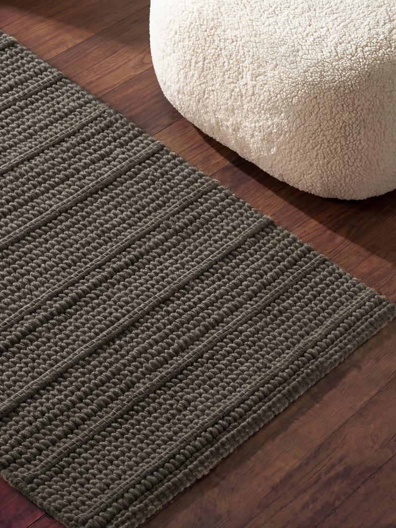 Powierzchnia dywanu składa się z regularnych poziomych pasów, w których naprzemiennie zastosowano dwa rodzaje struktury. Pierwszy z nich tworzy gęsty, drobny splot, przypominający delikatną tkaninę o jednolitej, zwartej fakturze. Drugi natomiast wyróżnia się bardziej wypukłą, plecioną strukturą, w której widoczne są większe, wyraźniejsze oczka przędzy. Dzięki temu na powierzchni dywanu powstaje subtelny efekt trójwymiarowości, który zmienia się w zależności od kąta padania światła.