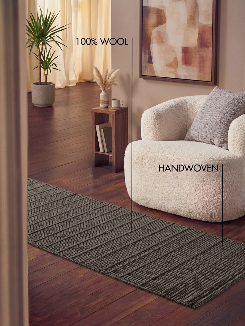Subtelne przenikanie się brązowych i szarych tonów podkreśla strukturę wełnianego splotu, nadając powierzchni dywanu głębię i naturalny charakter.