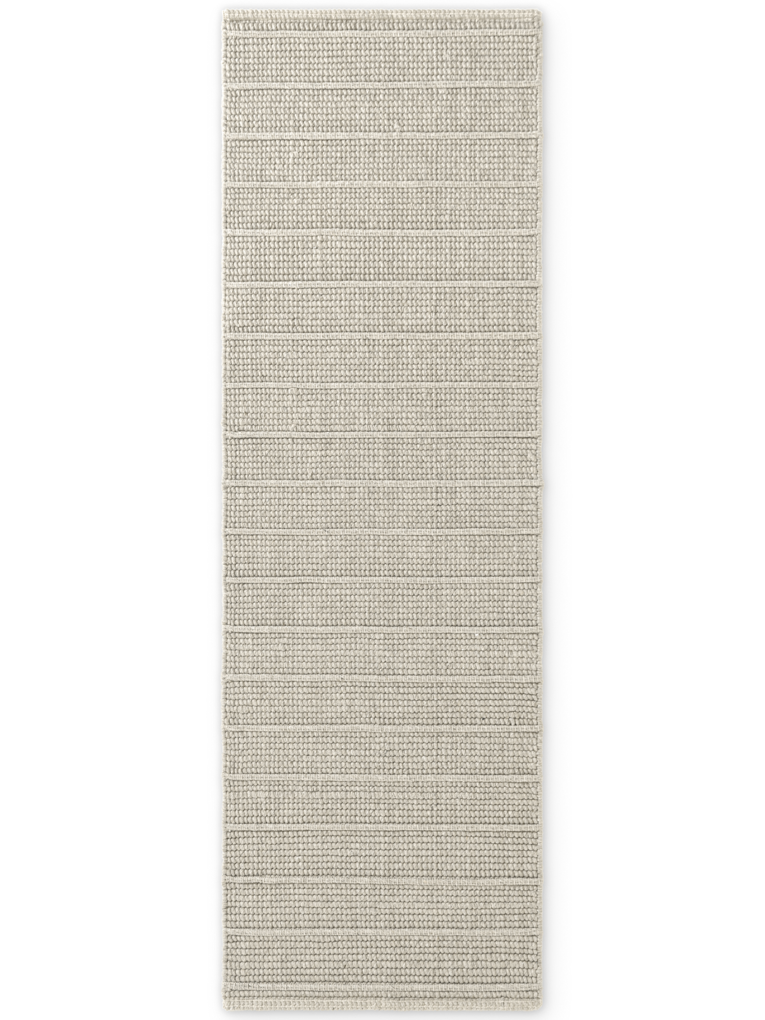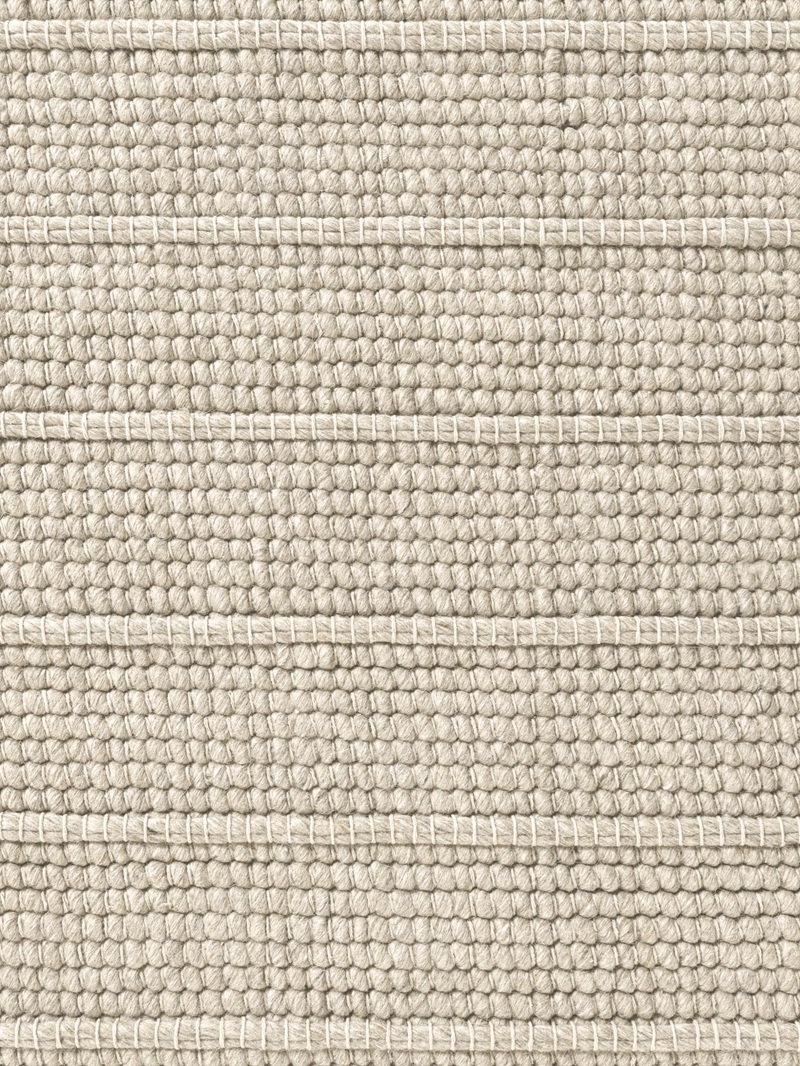 Powierzchnia dywanu składa się z regularnych poziomych pasów, w których naprzemiennie zastosowano dwa rodzaje struktury. Pierwszy z nich tworzy gęsty, drobny splot, przypominający delikatną tkaninę o jednolitej, zwartej fakturze. Drugi natomiast wyróżnia się bardziej wypukłą, plecioną strukturą, w której widoczne są większe, wyraźniejsze oczka przędzy. Dzięki temu na powierzchni dywanu powstaje subtelny efekt trójwymiarowości, który zmienia się w zależności od kąta padania światła.