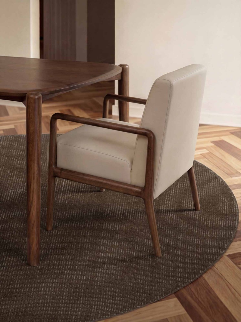 Dywan został ręcznie tkany z wysokogatunkowej wełny, dzięki czemu jest trwały, miękki w dotyku oraz odporny na codzienne użytkowanie. Jego minimalistyczna forma doskonale wpisuje się w aranżacje nowoczesne, skandynawskie oraz eleganckie wnętrza w stylu modern.