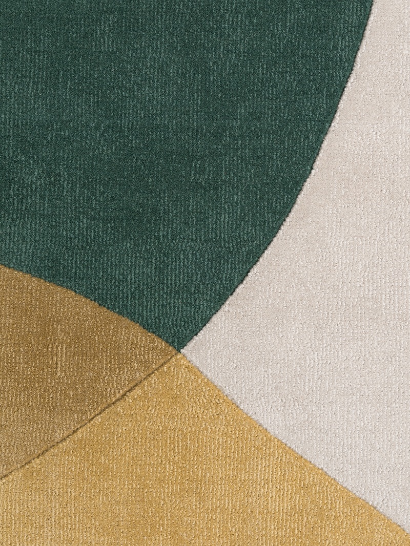 Dywan prezentuje elegancką i jednocześnie świeżą paletę barw, w której znajdują się: jasny błękit, pudrowy róż, głęboka zieleń, musztardowa żółć, ciepły karmel, subtelny pomarańczowy akcent, kremowa baza.