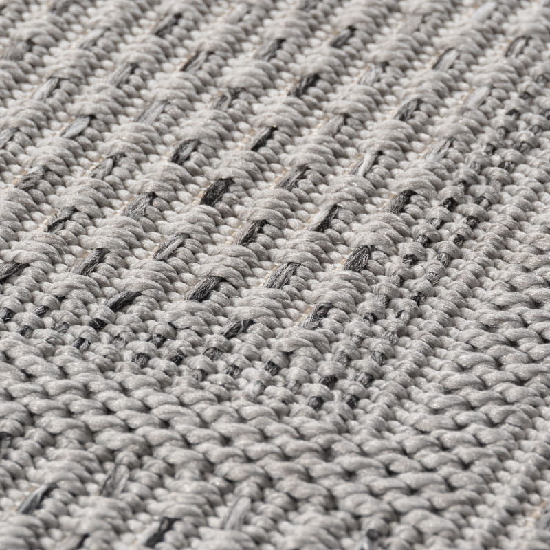 to ciekawa propozycja na aranżację otaczającej nas przestrzeni zarówno na zewnątrz, jak i wewnątrz pomieszczeń. Wykonanie techniką płaskiego tkania sprawia, że dywan zewnętrzny Desert Ramka szary nie posiada standardowego runa. Dzięki temu ma atrybuty inne niż dywany wykonane tradycyjną techniką z runem. Jest wodoodporny oraz odporny na promienie UV. Płaskie tkanie sprawia, że jest odporny na odkształcenia i odbarwienia.