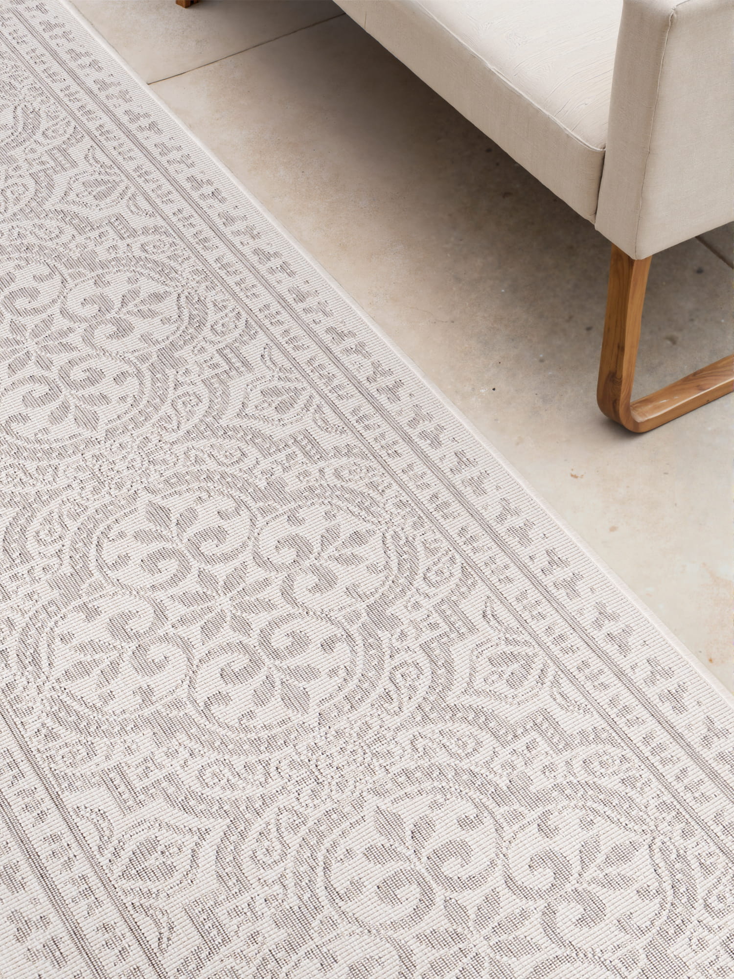 Dywan zewnętrzny dwustronny Duet Ornament szaro-kremowy Northrugs to dywan o uniwersalnym przeznaczeniu. Wykonany techniką tkania na płasko jest odporny na wodę i promienie UV. Dzięki temu znajdzie swoje zastosowanie na balkonie, tarasie, w przydomowej altanie oraz kuchni - wszędzie tam, gdzie nie sprawdzą się dywany wykonane tradycyjną metodą.