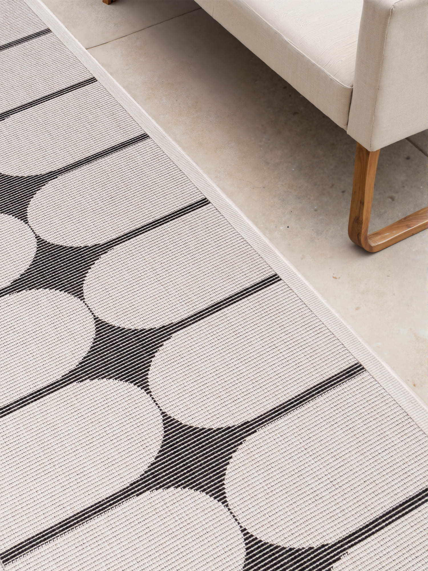 Dywan zewnętrzny dwustronny Duet kremowo-czarny Northrugs ma obydwie strony użytkowe.